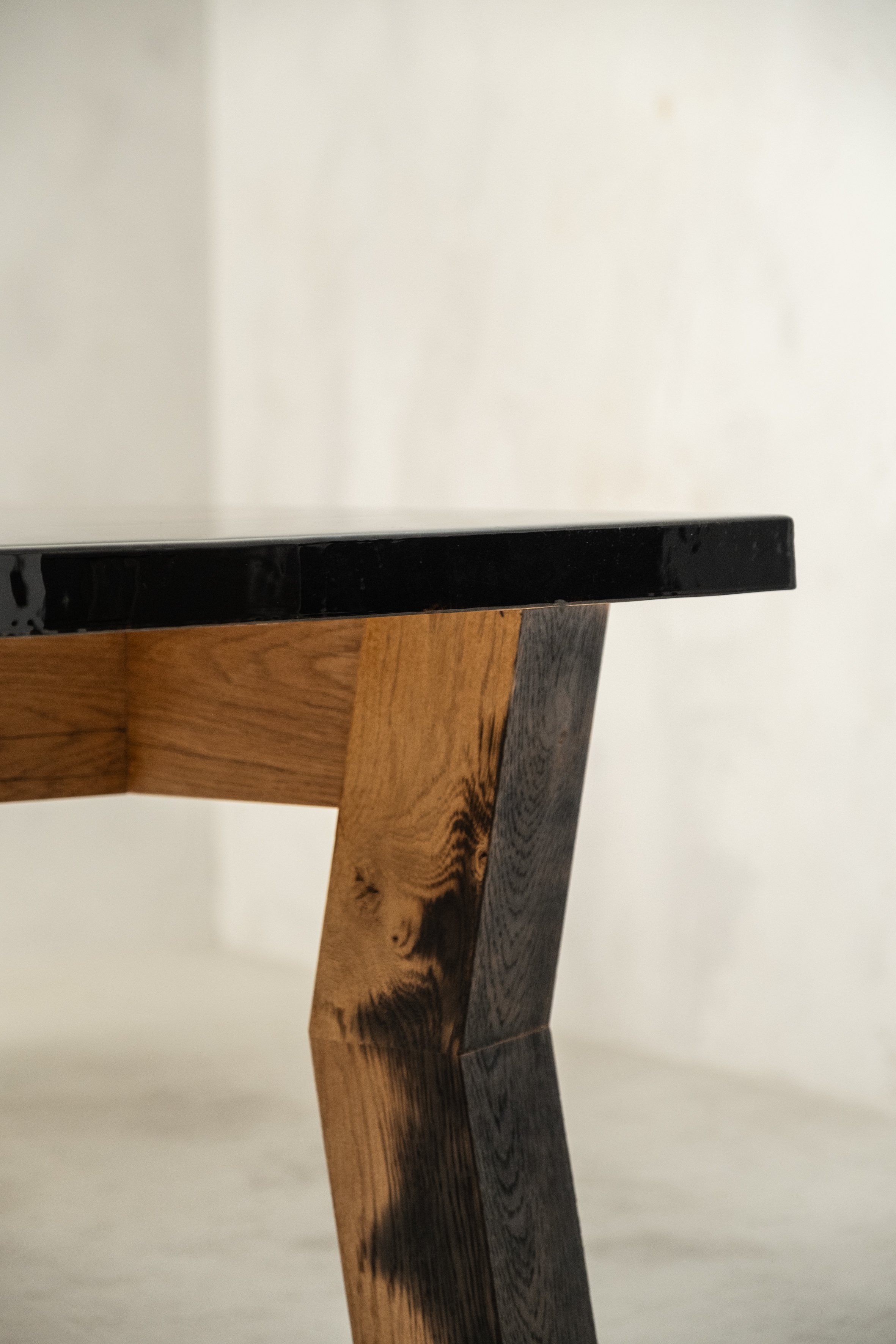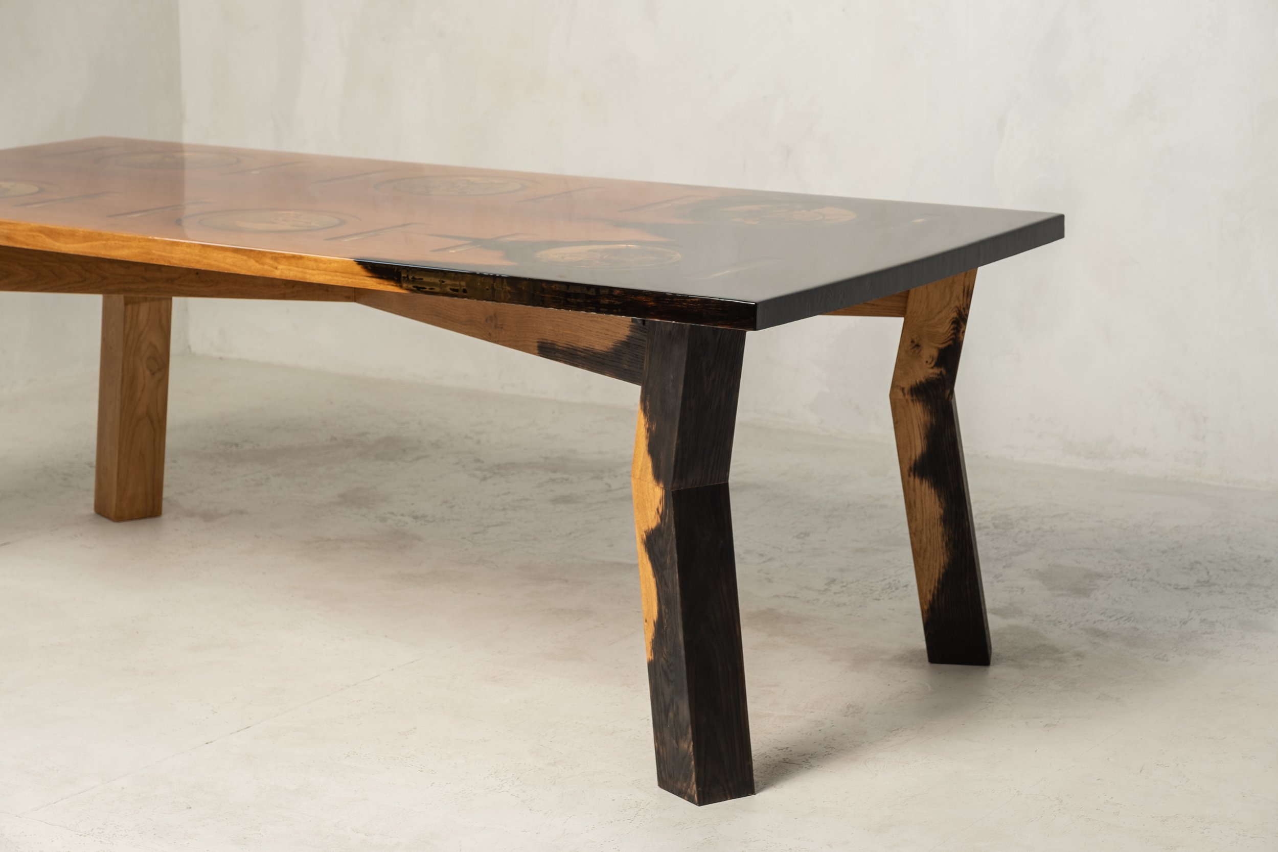 The Phoenix series draws inspiration from personal history. Alexander's grandfather's house burned down, rebuilt and renamed after the mythical bird that rises, resilient, from its own ashes. These monumental pieces feature deliberate burn marks, creeping elegantly onto one end of each table. On the table’s top, antique plates with a bird motif rest beneath the surface, creating a visual narrative of destruction and rebirth. The charred elements contrast with the delicate ceramics, celebrating renewal and the transcendent nature of beauty that survives, and is sometimes enhanced by destruction.